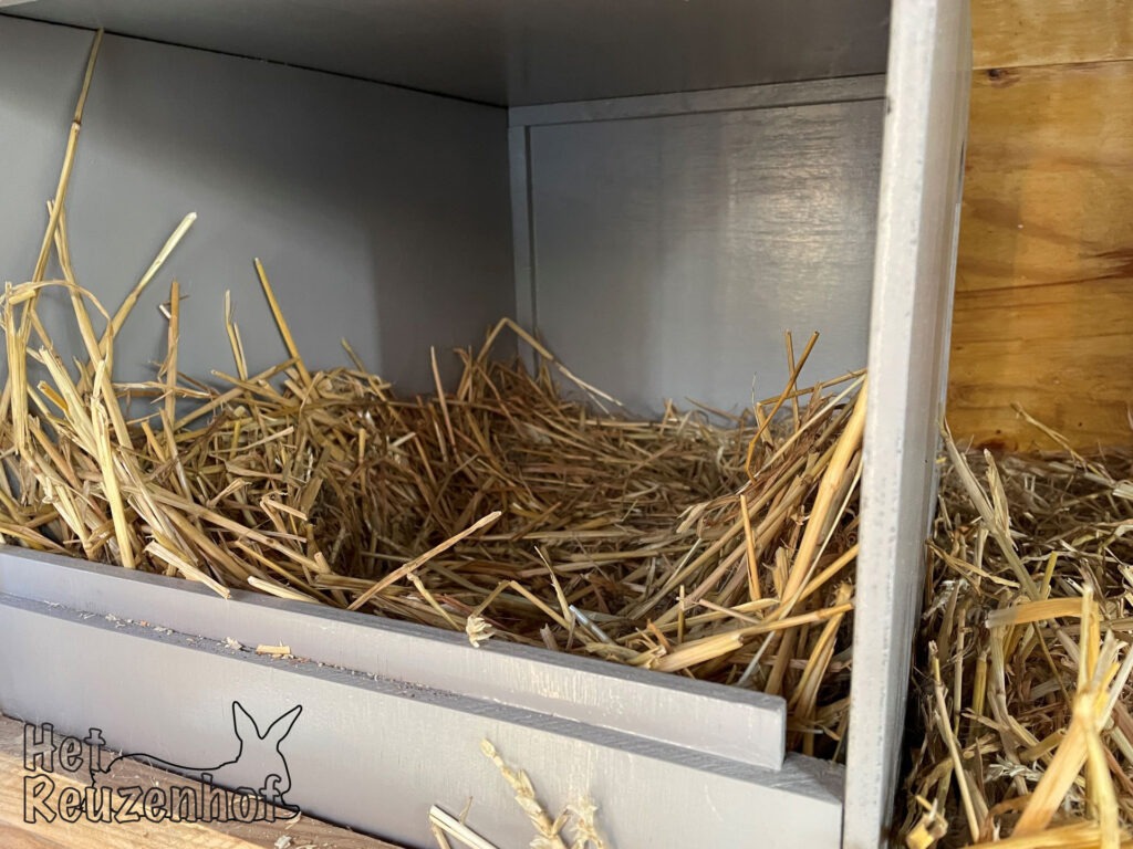 Daarnaast verwachten we einde deze week mogelijk een tweede nestje Vlaamse Reuzen. Ook deze voedster heeft de nestkast al vorige week rijkelijk gevuld met stro en zelfs al een aardige hoeveelheid haar geplukt. Dat kan een goed teken zijn, maar het zorgt ook voor enige twijfel: is ze daadwerkelijk drachtig?