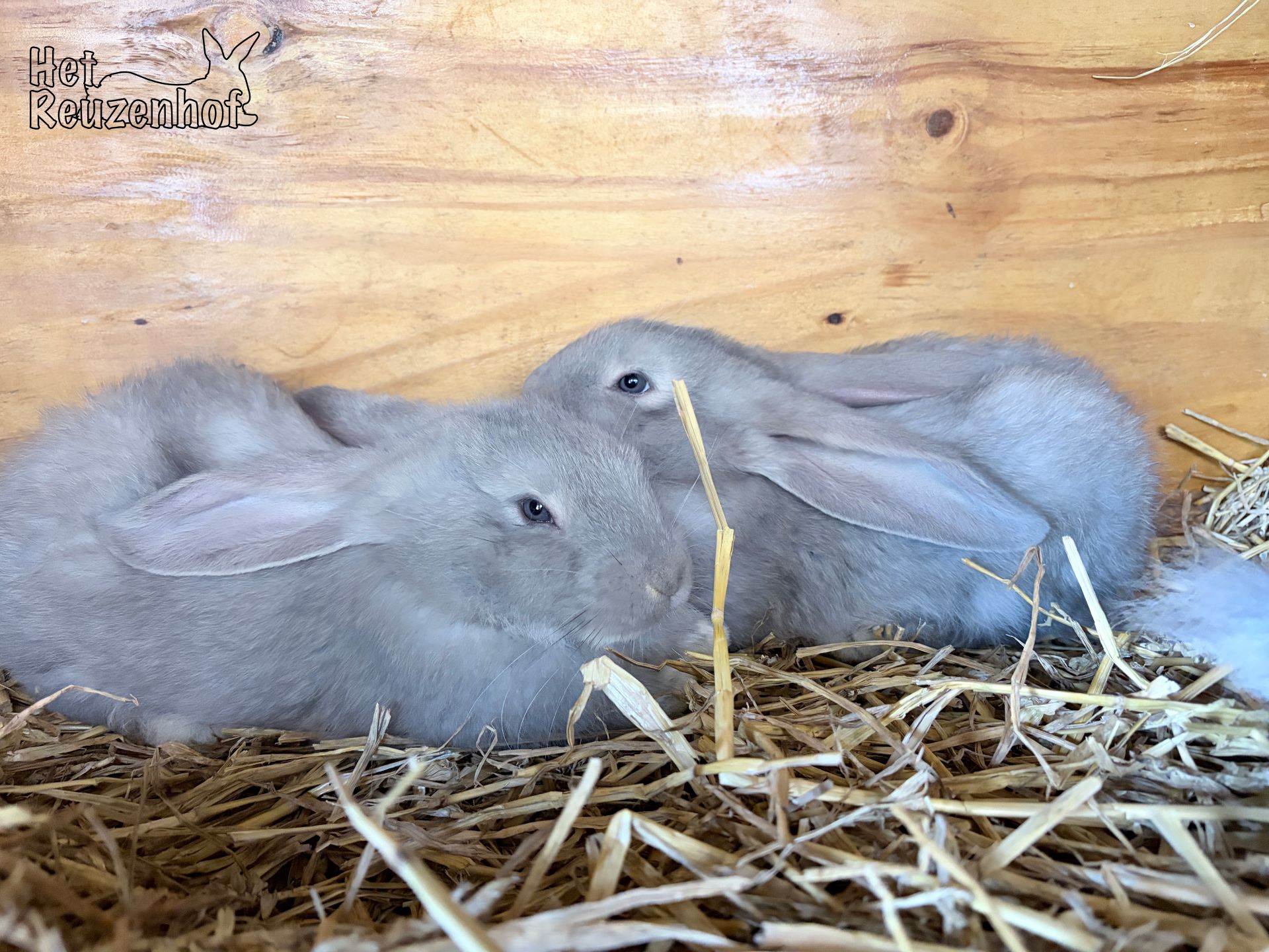 Onze jonge Vlaamse Reuzen doen het geweldig! Inmiddels zijn ze ruim 6,5 week oud en groeien ze echt als kool. Het is prachtig om te zien hoe actief en nieuwsgierig ze zijn. Vooral na het verschonen van hun hok zie je ze helemaal opleven – lekker rondhuppelen, spelen en uitgebreid genieten van het verse stro. Ze hebben het duidelijk goed naar hun zin! In de middag doen ze meestal een dutje en zoeken elkaar op om lekker bij elkaar te liggen.